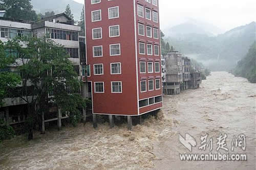 7月13日,有網(wǎng)友向記者反映,恩施州鶴峰縣鐵爐鄉(xiāng)有人把房子建到了河道中,眼下正是主汛期,看著十分揪心。從該網(wǎng)友發(fā)來(lái)的照片上可以看到,一幢7層的樓房直接建在了河道當(dāng)中,與周圍兩棟4層白色建筑形成了鮮明的對(duì)比,顯得十分突兀。照片里,湍急的河水急速地沖刷著這棟違建房的支柱,水流幾乎沖到了房子的底板上。