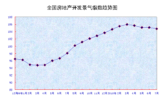 中新網(wǎng)8月10日電 據(jù)國(guó)家統(tǒng)計(jì)局網(wǎng)站消息,7月份,全國(guó)房地產(chǎn)開(kāi)發(fā)景氣指數(shù)(簡(jiǎn)稱“國(guó)房景氣指數(shù)”)為104.72,比6月份回落0.34點(diǎn),比去年同期提高6.71點(diǎn)。