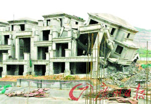 受金融風(fēng)暴影響,東莞虎門(mén)一樓盤(pán)建筑面積約600平方米的大戶型別墅出現(xiàn)銷(xiāo)售困難的窘態(tài)。為盤(pán)活市場(chǎng),該樓盤(pán)前兩日開(kāi)始將一套已完成整體框架結(jié)構(gòu)的大戶型別墅拆除,預(yù)計(jì)要拆除類(lèi)似別墅共15套。