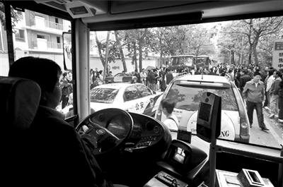 記者發(fā)現(xiàn),現(xiàn)場有9輛31路公交車被堵無法前行,公交司機(jī)們?nèi)齼蓛傻鼐墼诼愤吜奶。一名王姓司機(jī)說,他已被堵近1小時(shí),但因車隊(duì)未允許調(diào)頭返隊(duì),他只好原地等待。當(dāng)被問及如何處理車上乘客時(shí),他說,由于等待時(shí)間過長,乘客只能下車步行離開此地。