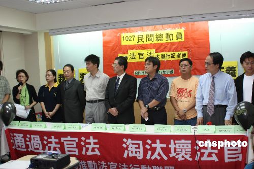 臺(tái)灣“民間推動(dòng)法官法行動(dòng)聯(lián)盟”十月二十五日召開記者會(huì)宣布,將于十月二十七日在臺(tái)北中正紀(jì)念堂前廣場發(fā)動(dòng)“我要法官法”大游行。組織者說,很多人進(jìn)法院是要追求公平正義,但卻因不良的法官,受到再次傷害,法官法法案中最重要的就是法官的淘汰機(jī)制。在臺(tái)灣, 法官法已推動(dòng)十幾年,至今尚未通過。中新社發(fā) 耿軍 攝