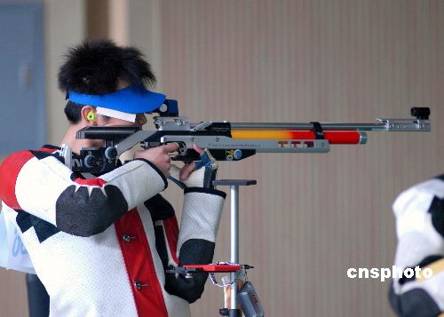 2007年10月26日,第六屆全國城市運動會“人保財險”杯射擊比賽在武漢關山射擊培訓中心鳴槍開賽。來自溫州市代表隊運動員朱啟南以703.7環(huán)的總成績,輕松奪得男子10米氣步槍60發(fā)決賽金牌,超過702.7環(huán)的世界紀錄和703.4環(huán)的全國紀錄;石家莊市代表隊運動員張強獲銀牌,杭州市代表隊運動員吳佳寧獲銅牌。中新社發(fā) 楚天行 攝