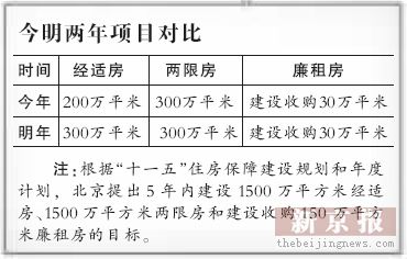 該負(fù)責(zé)人表示,下一步北京還將進(jìn)一步加大土地、規(guī)劃、財(cái)政等方面的支持力度,加快推進(jìn)經(jīng)適房、廉租房、兩限房的建設(shè)。明年將建設(shè)300萬平方米經(jīng)適房、300萬平方米兩限房,并建設(shè)收購30萬平方米廉租房。這意味著明年北京兩限房和廉租房的建設(shè)規(guī)模與今年大致持平,但經(jīng)適房將增加開工建設(shè)100萬平米。