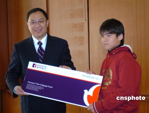 一月二日,澳門(mén)航空運(yùn)營(yíng)總裁陳新先生(左)在總部為澳門(mén)航空與澳門(mén)電訊聯(lián)合在澳門(mén)-大阪航線(xiàn)上舉辦的一項(xiàng)推廣活動(dòng)獲獎(jiǎng)?wù)哳C獎(jiǎng)。中新社發(fā) 史利 攝