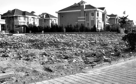 一片瓦礫、紅磚碎片,角落里并肩躺著4個抽水馬桶,旁邊堆著200多塊路牙石,曾經(jīng)小區(qū)里惟一聯(lián)排的別墅蕩然無存,與周圍紅墻藍瓦的整體風貌格格不入。2月22日,記者獲準在北京國際花園看到的這片廢墟,“造價”超過千萬。