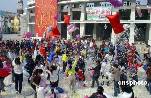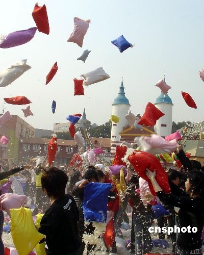 為慶祝即將到來的“三八”國際婦女節(jié),風靡歐美的游戲“枕頭大戰(zhàn)”3月3日在長沙世界之窗再次擂響戰(zhàn)鼓,千余名女性以枕頭當“武器”,互相投擲,發(fā)泄壓力。中新社發(fā) 肖前輝 攝