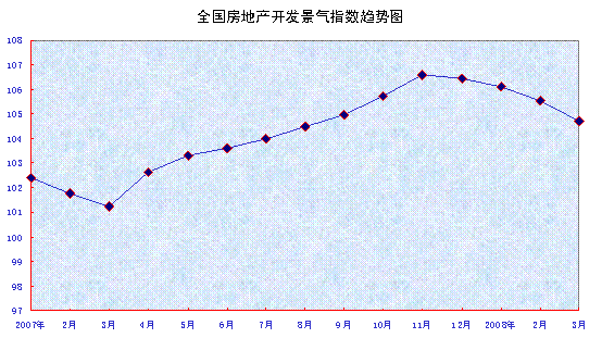 中新網(wǎng)4月18日電 據(jù)國(guó)家統(tǒng)計(jì)局網(wǎng)站消息,3月份,“國(guó)房景氣指數(shù)”為104.72,比2月份回落0.83點(diǎn),同比上升3.50點(diǎn)。