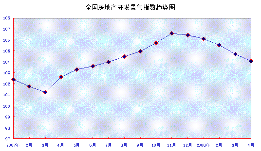 中新網(wǎng)5月16日電 據(jù)中國國家統(tǒng)計局網(wǎng)站消息,4月份,“國房景氣指數(shù)”為104.07,比3月份回落0.65點,同比上升1.42點。