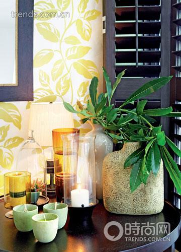 整幅畫(huà)面中最為濃重的一筆當(dāng)屬貼近窗邊的角落,一樣是深色圓茶幾,上面擺放的花瓶十分古樸,插花也顯得更為隨性和張揚(yáng)。蠟燭不再是單一的白色,茶綠色的三杯小蠟自成一體,身后還藏著黃色的蠟燭與玻璃器皿。