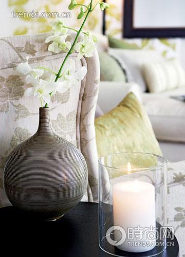 布藝沙發(fā)也同樣遵循了花色與純色混搭的原則,奶白色的雙人沙發(fā)用淺灰綠的靠包來(lái)點(diǎn)綴,分坐兩旁的單人沙發(fā)則使用枝葉與花朵的暗紋來(lái)處理,旁邊配上深色的小茶幾,精致的圓肚細(xì)頸花瓶里悄悄探出一枝素雅的白色蝴蝶蘭,跟玻璃罩內(nèi)點(diǎn)燃的白色蠟燭相映成趣。