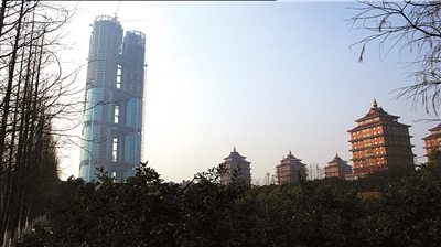 目前,摩天大樓初見規(guī)模——60層高的主樓已經(jīng)封頂,三足鼎立,托起一個巨大的球體,5個空中花園,聯(lián)通三足。