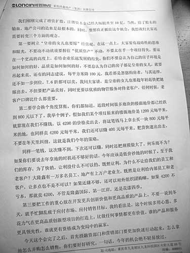 昨日,重慶一網(wǎng)友自稱貼出隆鑫地產(chǎn)一份高層內(nèi)部南山會(huì)議講話稿的照片,其稱在春節(jié)后,隆鑫地產(chǎn)欲對(duì)旗下樓盤(pán)降價(jià),以期快速回籠資金去買(mǎi)地?cái)U(kuò)張規(guī)模。從內(nèi)容上看,講話者像是為隆鑫降價(jià)做動(dòng)員工作,表明降價(jià)的目的是快速回籠資金并擴(kuò)大規(guī)模。網(wǎng)友在跟帖中稱,萬(wàn)科松山湖會(huì)議紀(jì)要事件驚現(xiàn)重慶版,隆鑫降價(jià)講話遭網(wǎng)絡(luò)泄密。隆鑫地產(chǎn)一位不愿意透露姓名的高層告訴記者,內(nèi)部正在追查泄密者。