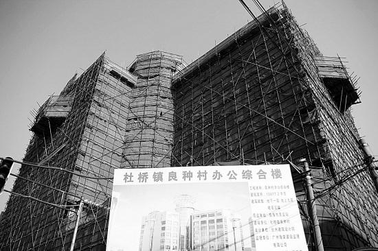說(shuō)它是熱帖,準(zhǔn)確地說(shuō)其實(shí)就是一組照片。照片中,一幢大樓拔地而起,主體框架已搭建完畢,不過由于尚未完工,整幢大樓像是穿上了一層漁網(wǎng)服。大樓底下立著一塊規(guī)劃牌,最上面寫著“杜橋鎮(zhèn)良種村辦公綜合樓”,中間是大樓的效果圖,9層高的大樓看上去頗為壯觀。
