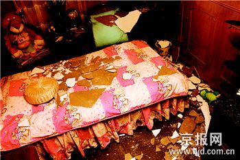 李先生心有余悸的告訴記者,“接著我就走進了臥室,看到房頂?shù)乃嗳种嫉袅讼聛,再看地上都是碎片和渣土。幸好昨天我睡覺睡得晚,要不這要給砸著……嚇得我和我愛人一晚上都沒睡好覺!