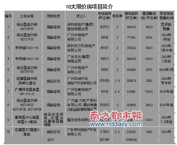 廣州將在今明兩年向市場推出10個限價房項目,最高限價6500元/平方米,最低只有2800元/平方米。昨日,廣州市國土房管局公布了這10個限價房項目的詳細(xì)情況和預(yù)計銷售時間。業(yè)內(nèi)人士分析指出,今年限價房的供應(yīng)比例占到廣州商品房市場的20%,將會壓制限價房周邊地區(qū)的房價。