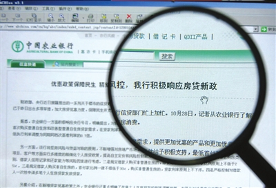昨天下午,農(nóng)行成為本輪新政出臺后首家發(fā)布房貸細則的銀行,但在當天晚上,農(nóng)行市場部卻通知記者:“該細則有些細節(jié)還要改動,監(jiān)管部門已將掛在農(nóng)行首頁上的相關(guān)文章撤下!庇浾唠S后打電話咨詢銀監(jiān)會相關(guān)負責人,該負責人表示沒有下達過指令,不清楚是什么情況。有業(yè)內(nèi)人士坦言,新政策“很難把握”,還得再看看。
