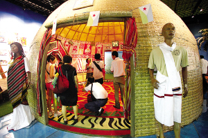 外墻頂部覆蓋著手編織帶,兩壁腰墻和地面分飾有手編掛毯和地毯,內(nèi)墻上掛有圖案抽象的繪畫(huà)和手工藝品,小小民居包羅萬(wàn)象——一走進(jìn)非洲聯(lián)合館內(nèi)的吉布提館,就能見(jiàn)一座蝸形民居“浮于水上”。這是吉布提游牧民族阿法爾人的傳統(tǒng)民居,叫“達(dá)布瓦塔”。上海世博會(huì)上的這個(gè)72平方米大小的達(dá)布瓦塔,全系在吉布提國(guó)內(nèi)造好再裝進(jìn)集裝箱漂洋過(guò)海而來(lái),所以俱是原汁原味的吉布提當(dāng)?shù)仫L(fēng)情。