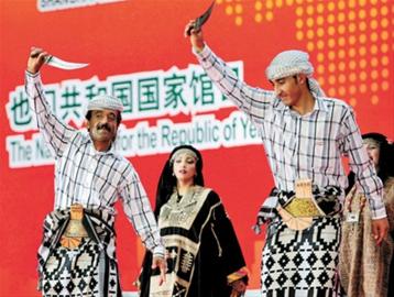 也門位于阿拉伯半島西南端。也門館館內(nèi)設(shè)計仿照薩那老城 “銅器市場”的樣貌,并在背景上采用薩那老城古老塔樓的照片。(張駿)