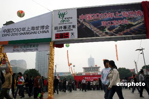 十月二十五日,中國(guó)2010年上海世博會(huì)倒計(jì)時(shí)919天之際,世博會(huì)倒計(jì)時(shí)電子鐘在杭州武林廣場(chǎng)揭幕。這是中國(guó)申辦世博會(huì)成功后,首個(gè)在上海市以外地區(qū)設(shè)置的倒計(jì)時(shí)電子鐘,這標(biāo)志著這一屆由中國(guó)主辦、上海承辦的世界博覽會(huì)將與長(zhǎng)三角地區(qū)對(duì)接。長(zhǎng)江三角洲的浙江、江蘇兩省將聯(lián)合上海共同迎接這一“國(guó)際經(jīng)濟(jì)、科技、文化的奧林匹克”盛會(huì)。中新社發(fā) 許曉青 攝