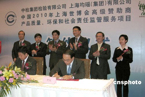 一月十八日,效法北京奧運(yùn)模式,中國檢驗認(rèn)證集團(tuán)有限公司在上海與中國二0一0年上海世博會特許產(chǎn)品生產(chǎn)高級贊助商簽署世博特許產(chǎn)品質(zhì)量、環(huán)保監(jiān)管服務(wù)項目協(xié)議。圖為世博會高級贊助商之一的上海均瑤(集團(tuán))有限公司與中檢集團(tuán)簽約。結(jié)合北京奧運(yùn)會特許產(chǎn)品質(zhì)量監(jiān)控經(jīng)驗,未來中檢集團(tuán)將對上海世博會各大類特許產(chǎn)品實行原料、生產(chǎn)、加工、管理、包裝及銷售的全流程質(zhì)量控制,包括對上海世博會吉祥物“海寶”衍生產(chǎn)品的質(zhì)量監(jiān)控。中新社發(fā) 許曉青 攝