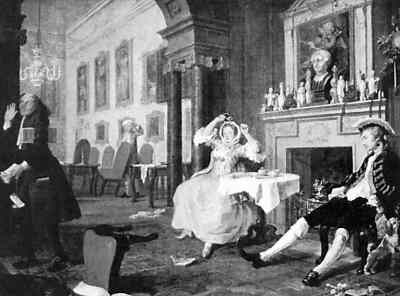 首先惹禍的是幾幅油畫作品。英國(guó)畫家威廉·霍加斯的著名作品《時(shí)髦的婚姻》在當(dāng)時(shí)被展出,這組畫共有6幅:訂婚、時(shí)髦婚姻、求醫(yī)、音樂(lè)會(huì)、決斗、自殺。正是這一組帶有強(qiáng)烈批判意義的畫引發(fā)了上流社會(huì)的不滿和爭(zhēng)議,紅衣大主教更是大發(fā)雷霆,下令禁士教士、學(xué)校校長(zhǎng)和家長(zhǎng)前去參觀,這件事在當(dāng)時(shí)也鬧得沸沸揚(yáng)揚(yáng)。