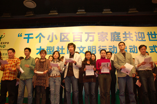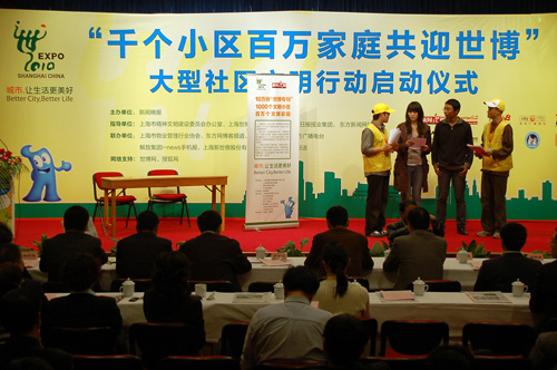 4月8日下午,“千個小區(qū)百萬家庭共迎世博”大型社區(qū)文明行動啟動儀式舉行。據(jù)悉,為了讓更多市民參與世博、服務世博,活動將從2009年4月一直持續(xù)到2010年10月結(jié)束。