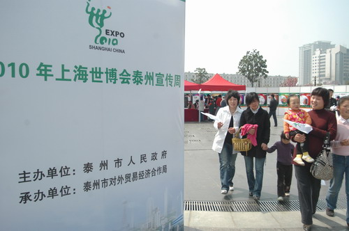 為了讓更多的泰州市民和企業(yè)“了解世博、支持世博、貢獻世博、共享世博”,江蘇省泰州市政府和上海世博局于4月6日至12日分別在溱湖國家濕地公園和位于鬧市區(qū)的濱河廣場開展了“2010年上海世博會泰州宣傳周”活動。