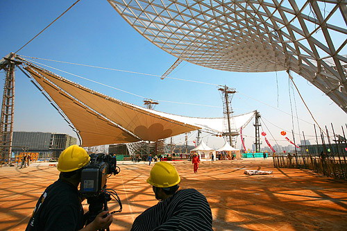 中新網(wǎng)4月30日電 據(jù)上海世博會官方網(wǎng)站消息,今天,世博軸上首批兩個喇叭狀的陽光谷正式落成,同時頂棚膜結構張拉啟動,這標志著世博軸上部主體工程即將全面完工。上海世博會執(zhí)委會專職副主任鐘燕群、上海世博局副局長丁浩等出席儀式。鐘燕群宣布啟動世博軸頂棚膜結構張拉。