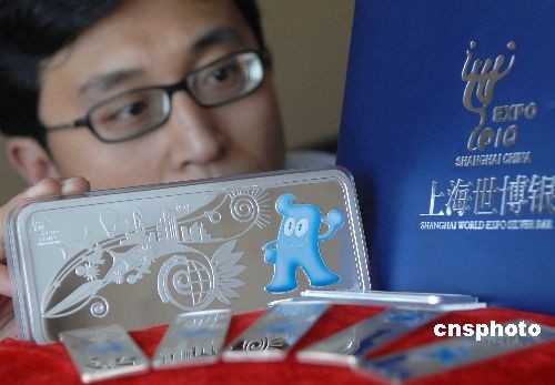 5月22日,由上海世博會(huì)事務(wù)協(xié)調(diào)局授權(quán)、中國印鈔造幣總公司鑄造發(fā)行的一款以世博會(huì)為題材的銀條——上海世博銀將于近日在交通銀行指定網(wǎng)點(diǎn)銷售。據(jù)了解,本次即將發(fā)售的上海世博銀以上海世博會(huì)為題材,設(shè)計(jì)上則融入了世博會(huì)吉祥物、地球與花朵、城市場景等眾多元素,由人和城市場景共同組成“EXPO”圖案也完美體現(xiàn)了此次上海世博會(huì)的“城市”主題。中新社發(fā) 遠(yuǎn)舟 攝