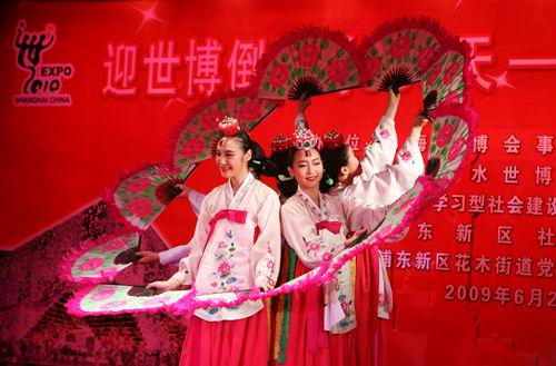 6月27日下午,上海市浦東新區(qū)花木社區(qū)文化活動中心熱鬧非凡,熱烈的掌聲和歡快的音樂聲不時地響起,由上海世博局和2012年韓國麗水世博會組委會聯(lián)合主辦、上海市學(xué)習(xí)型社會建設(shè)服務(wù)指導(dǎo)中心和浦東新區(qū)社區(qū)學(xué)院協(xié)辦的“迎世博倒計(jì)時300天——中韓民眾社區(qū)大聯(lián)歡”活動正在這里舉行。麗水世博會組委會秘書長金丙一、韓國駐滬副總領(lǐng)事延上模、上海世博局副局長朱詠雷、上海市學(xué)習(xí)型社會建設(shè)服務(wù)指導(dǎo)中心副主任王連華等出席活動。