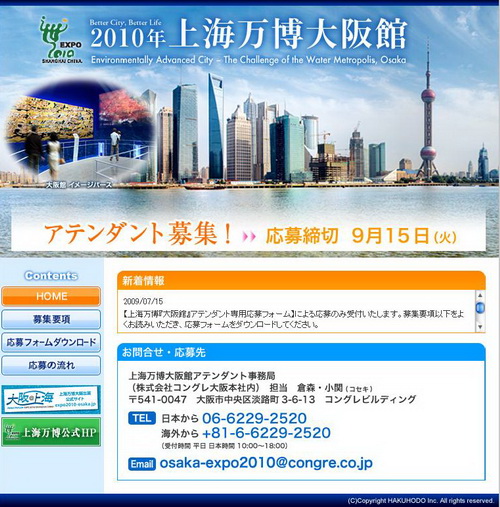 7月17日,記者從2010年上海世博會日本大阪城市最佳實踐區(qū)案例工作人員招聘網站上獲悉,世博會日本大阪城市最佳實踐區(qū)案例開始招聘工作人員,計劃招聘約15名,工作崗位包括日常接待、講解、導游、VIP接待、活動宣傳等。受聘者將作為康格會展(上海)有限公司的員工被雇用,工作期限為2010年4月1日至10月31日。