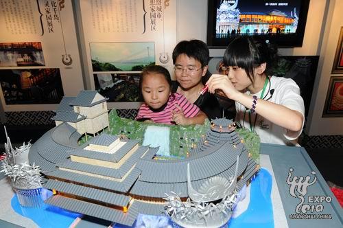 一位老人帶著他的小孫女在貴州館模型前仔細(xì)觀賞,“孩子你看,這個是黃果樹瀑布,這個是苗族女孩子在節(jié)日里穿的衣服,這個是……”老人表示,這是一個很好的機會,帶孩子來了解一下自己年輕時工作的地方,也讓她能夠多增長一些世博知識。更重要的是,貴州可以說是他的第二故鄉(xiāng),前來參觀也是為了對貴州參展表示支持。