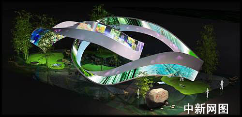 李沛介紹,整個(gè)展館將掩映于竹林碧水之間,環(huán)體主體材料為竹結(jié)構(gòu),外表則用紙作裝飾,十分環(huán)保。展館分為一個(gè)立體影院和自然桃花源、人文桃花源、理想桃花源三方面的內(nèi)容。其中自然桃花源以自然風(fēng)光為主要內(nèi)容,向觀眾展現(xiàn)湖南秀美的湖光山色,使其感受到大自然的博大睿智;人文桃花源則是表達(dá)都市的理解、關(guān)愛(ài)與和諧,表達(dá)“惟楚有才,于斯為盛“的人文情懷;理想桃花源則是表現(xiàn)人與城市、與自然的融合,觀眾們可以用電子壁畫(huà)等多媒體現(xiàn)代手段在現(xiàn)場(chǎng)任意涂鴉,抒發(fā)對(duì)于未來(lái)城市的暢想。