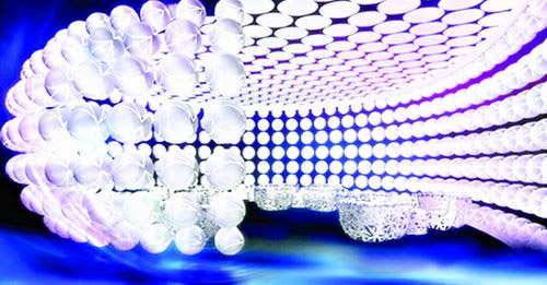 幻影繡球——在展示大廳中心懸墜直徑在60—80厘米之間的幻影繡球,繡球外觀經(jīng)時(shí)尚化、科技化處理,通體為透明材質(zhì),內(nèi)嵌4塊顯示屏達(dá)到全角度視頻展示,通過地面投影、LED視屏與照片傳輸技術(shù)融為一體的時(shí)尚科技完成即時(shí)成像,當(dāng)參觀者走過幻影繡球下時(shí),繡球上便會(huì)映出相應(yīng)影像。
