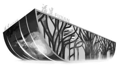 福建地處祖國東南沿海,面向臺灣海峽,依山傍海,擁有豐富的生態(tài)資源和漫長的海岸線。因此,福建館整體外觀設(shè)計為船形,以“綠、藍、白”為主色調(diào),正面為綠色榕樹造型,兩側(cè)船頭為藍色大海影像墻,頂部為白色橫梁,充分體現(xiàn)福建山中有城、城中有山,城海相連、海城一色的景象。整個展館像一艘在臺灣海峽中乘風(fēng)破浪的“生態(tài)船”,展現(xiàn)了福建作為綠色大省的風(fēng)采。