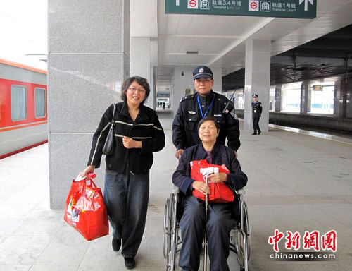 中新網(wǎng)徐州4月24日電 (耿晴 張良燦 侯啟光)“您好,我是上海鐵路民警,請問要到哪去?輪椅我來幫您推! ”在上;疖囌6號候車室,來自徐州鐵路公安處援滬安保民警邊詢問邊接過一旅客手中的輪椅!奥闊┠鷰兔α,我媽身體不好只能坐輪椅,謝謝!”身后,一位拿著兩個大包裹的中年女性旅客連連道謝,民警會同世博志愿者一直將老人送上了列車。