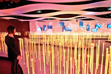 該館整體LED燈管約有11萬米,能夠形成三維的顯示矩陣。從5月1日開始,每天晚上閉館之前,將有這樣一個8分鐘左右的秀。經(jīng)歷一個“魔方”蘇醒的過程,觀眾會聽到“魔方”的“心跳”,當“讓我們蕩起雙槳”音樂片段配合著企業(yè)聯(lián)合館的三維畫面,過去的片段在腦海中浮現(xiàn)。