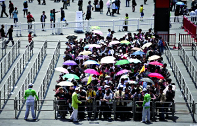 世博園6號入口位于世博軸南端,是世博園最主要的入口之一。昨日8時45分,入口處已聚了數(shù)百名游客。安檢口共64個,其中東西兩側(cè)的10個入口是無包游客的快速通道。