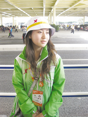 張筠老家在江西,是復旦大學視覺藝術學院的大一學生,標準的90后女孩。通過網上報名并獲得任用后,她成為了上海世博會首批志愿者,而如果再細分則可稱作“高峰期志愿者”!懊刻煸缟7點半不到就得到園區(qū),晚上下班時間不定,至少10點以后吧!睆報薷嬖V記者,她每天要做的,就是站在這處位于商業(yè)中心最繁華的街角,為任何有需要的游客提供力所能及的幫助。接受采訪時,女孩才正式上崗短短半日,“已經為至少20個游客指路,或是回答他們的一些咨詢。”