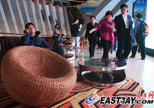 以“崛起的大國”為主題的南非館這次完全舍棄了野生動物、美麗風(fēng)光等常態(tài)化展示,而是用一個球形的視頻墻占據(jù)在展館中央,四周圍放置著竹編的各式藤椅。負(fù)責(zé)籌建和部分設(shè)計的南非館的中方負(fù)責(zé)人黎先生告訴東方網(wǎng)記者,由于南非館將在世博會期間進(jìn)行五大主題的展示,“只有視頻能夠最好展現(xiàn)出來。”
