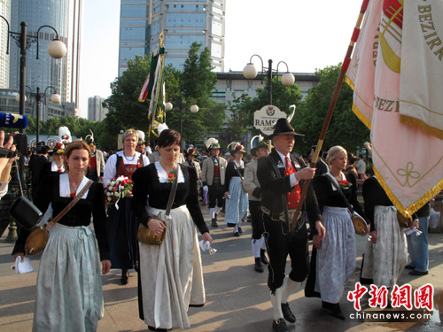 中新網南京5月23日電(申冉 閆正偉)今天下午,南京市中心山西路的市民廣場上空飄蕩著來自奧地利美麗山崗原野間的優(yōu)美圓舞曲,穿著奧地利民族服裝的奧地利施瓦茨市長樂團樂手們帶著他們淳樸悠揚的旋律和歡快自由的舞步,給南京市民送來了一個充滿著奧地利音樂狂歡節(jié)日氣氛的初夏周末。