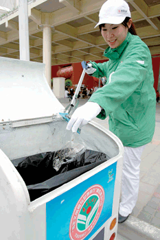 董磊有著五年的法國留學(xué)經(jīng)歷,來世博園前在南匯一家企業(yè)從事人事工作!敖衲瓿跷宜诘膯挝徽心贾驹刚撸⻊(wù)世博會。作為一名土生土長的上海人,我立刻報了名。”董磊告訴記者,來世博園之前,他并沒有想到自己來這里的工作是和垃圾打交道!爱(dāng)時我被分配的工作是做管理,但來到這里以后我才發(fā)現(xiàn),由于人手等各方面因素,幾乎每天我們都要自己動手收運果殼箱!倍诟嬖V記者,現(xiàn)在的工作雖然累,但是能夠為世博會服務(wù),能夠讓自己得到鍛煉,他的心里非常高興!皝硎啦﹫@之前,其實我就做好了心理準備,再苦再累也要上!