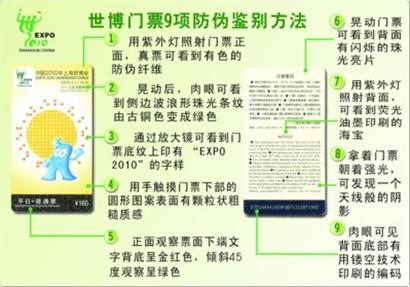 世博會園區(qū)現(xiàn)場白蓮涇、高科西路、長清北路、上南路、后灘、魯班路、西藏南路、半淞園路、馬當(dāng)路、東昌路水門等10個出入口,銷售當(dāng)日普通票、當(dāng)日優(yōu)惠票、當(dāng)日夜票等三種門票。
