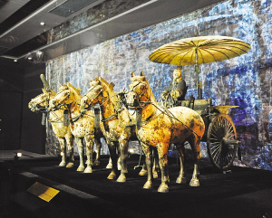 秦俑館銅車馬共兩乘,此次在中國(guó)館展出的“一號(hào)銅車馬”為雙輪、單轅、駟馬系駕,總重約1061公斤。主體為青銅所鑄,通體飾有精美彩繪,配有1000多件金銀配飾。“一號(hào)銅車馬”在中國(guó)館“國(guó)之瑰寶”展區(qū)展出,展示將持續(xù)到世博會(huì)閉幕。