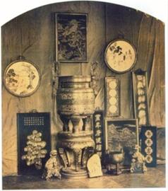 史料記載,1862年世博會(huì)上中國(guó)的參展規(guī)模很小,沒有單獨(dú)的展館,只是在主展廳內(nèi)有一個(gè)小小的展區(qū)展出一些陶瓷等中國(guó)土特產(chǎn)。照片印證了這一點(diǎn)。中國(guó)展示的有瓷器、佛像、琺瑯器、寶塔等,還有一張巨幅祖宗油畫。沒有獨(dú)立展館,但一個(gè)外國(guó)孩童正定睛觀看展品,初步顯示了東方藝術(shù)獨(dú)特魅力。