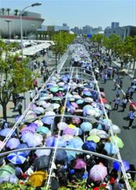 當(dāng)記者沿著世博軸緩步來(lái)到博成路高架步道下方的沙特館排隊(duì)區(qū)域入口時(shí),時(shí)間已是9:25。入口處的沙特館工作人員手上的告示牌已經(jīng)寫(xiě)著“沙特館排隊(duì)時(shí)間約8小時(shí)”,不少游客看到標(biāo)示后就放棄了排隊(duì),但更多的游客選擇繼續(xù)堅(jiān)持。已經(jīng)73歲的付老先生說(shuō):“之前就選定傳聞中很好看,但排隊(duì)時(shí)間長(zhǎng)的沙特館作為世博游第一站,下定決心要把最難排到的場(chǎng)館先看掉!崩先耸虑耙褱(zhǔn)備好遮陽(yáng)帽、攜帶式小椅、食物和水等物品,即使真要排9小時(shí)也要堅(jiān)持下去。