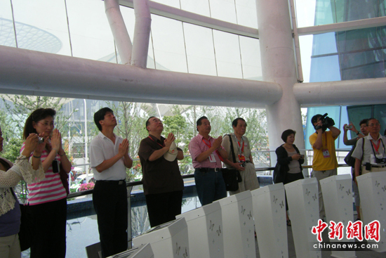 僑界人士隨后在臺灣館內(nèi)的LED點燈水臺共同祈福,希望中華民族能夠團結(jié)和睦,人民生活安定。