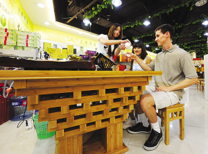 來自美國休斯敦的青年蓋瑞,攜女友一起進入世博園區(qū)的世博文化中心后,被一股清香甘醇的茶香所吸引,一腳踏進了設(shè)在這里的帝芙特國際茶文化園內(nèi)。“中國茶口感真好,包裝造型也很時尚,我很喜歡!痹谄穱L了天臺山云霧茶等幾款茶水后,蓋瑞表示要把上海茶帶回美國,讓家人和朋友分享!