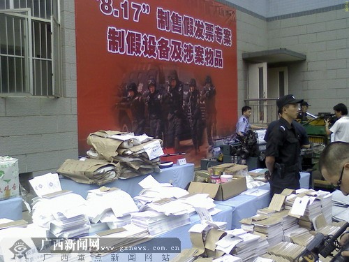 南寧市公安局11日向社會披露,7月7日,在(廣西)自治區(qū)公安廳的領(lǐng)導和指揮下,該局成功破獲了公安部督辦的以曾某為首的非法制造出售假發(fā)票犯罪團伙的特大案件(簡稱“8.17”專案)。搗毀大型假發(fā)票印制窩點1個、假發(fā)票藏匿窩點1個,抓獲涉案人員10人,繳獲假發(fā)票82.94萬份,累計票面金額53.3億元,涉稅金額2.46億元;印制假發(fā)票的機器設(shè)備4臺、模版、底片、印章、紙張、油墨等制假材料一批。這是目前為止廣西累計票面金額最大的假發(fā)票案。