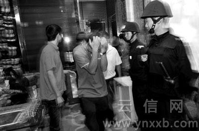 “緊急通知,今晚九點(diǎn)半在分局集中,參加統(tǒng)一行動!蓖21時左右,官渡公安分局治安大隊(duì)民警們突然接到了臨時通知。22時,內(nèi)線發(fā)出信號,警車開往珥季路某娛樂會所。當(dāng)50多名全副武裝的警察沖進(jìn)該娛樂場所時,訓(xùn)練有素的迎賓們并沒有慌亂,漂亮的姑娘們依舊招牌式笑著:“歡迎光臨”。